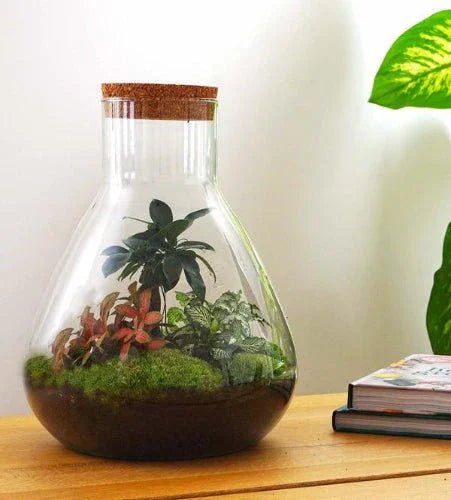 Stevige en degelijke ronde terrarium fles met kurk. Gemaakt van gerecycled glaswerk.